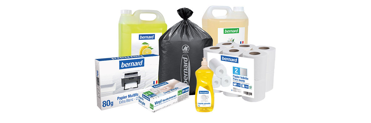 Om het aanbod van diensten aan ondernemingen en professionals te vervolledigen, levert Bernard ook essentiële verbruiksartikelen zoals wegwerphandschoenen, verschillende gamma's vuilniszakken en kantoorbenodigdheden.